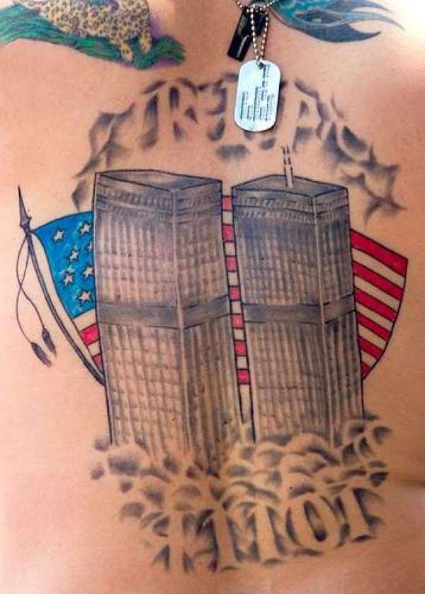 背部彩色撕裂911摩天大楼纪念纹身