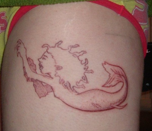 腿部简约卡通红色美人鱼纹身
