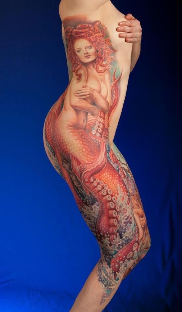腰侧非常逼真的彩色诱惑美人鱼纹身
