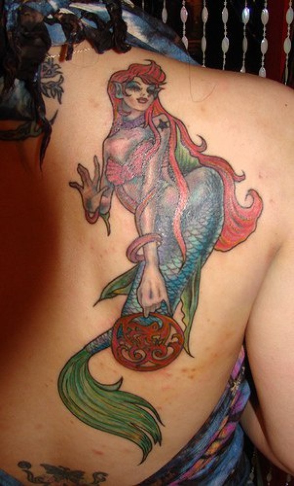 肩部彩色红头发美人鱼纹身图片
