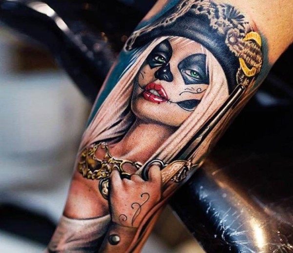 手臂彩色插画风格的墨西哥女郎纹身
