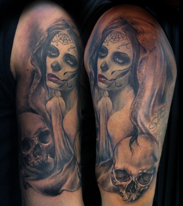 肩部棕色墨西哥传统彩色妇女肖像纹身