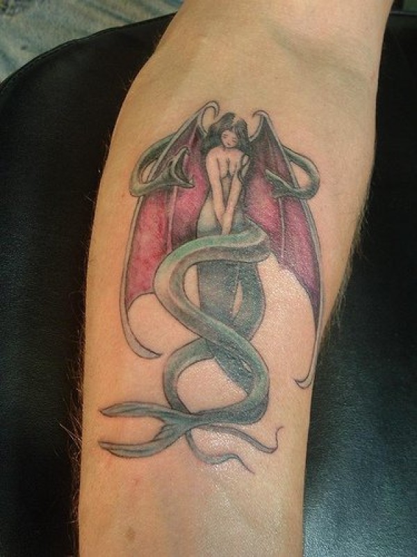 手臂彩色九头蛇美人鱼纹身图案