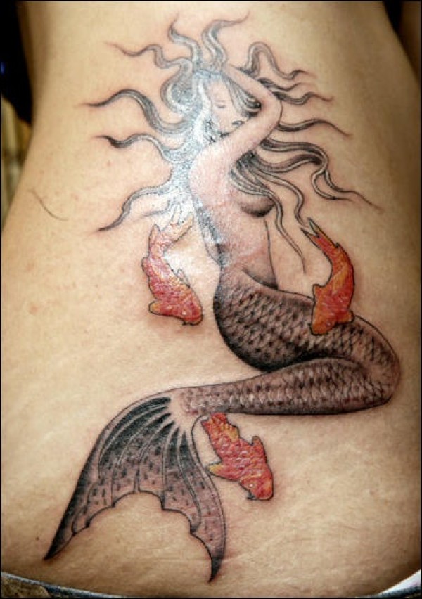 腰侧彩色美人鱼锦鲤鱼纹身图片