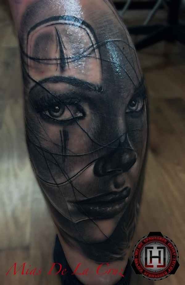 腿部墨西哥传统风格女人肖像黑灰纹身