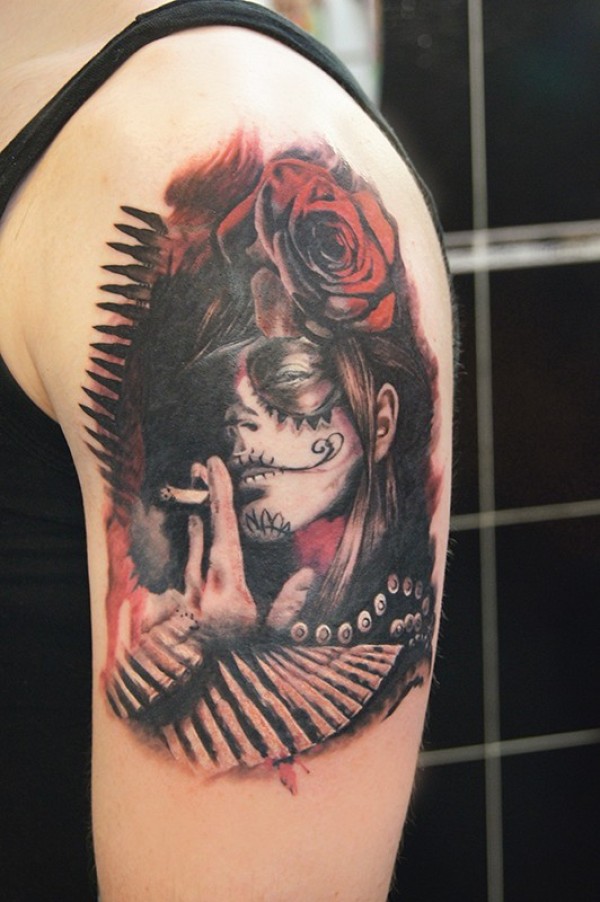 肩部墨西哥传统风格吸烟妇女纹身图片