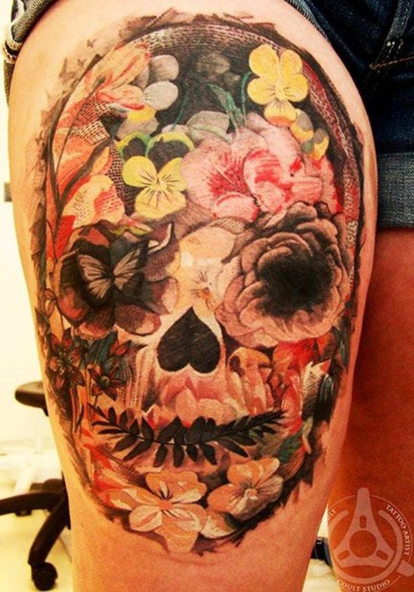 墨西哥土著传统彩色骷髅花纹身图片