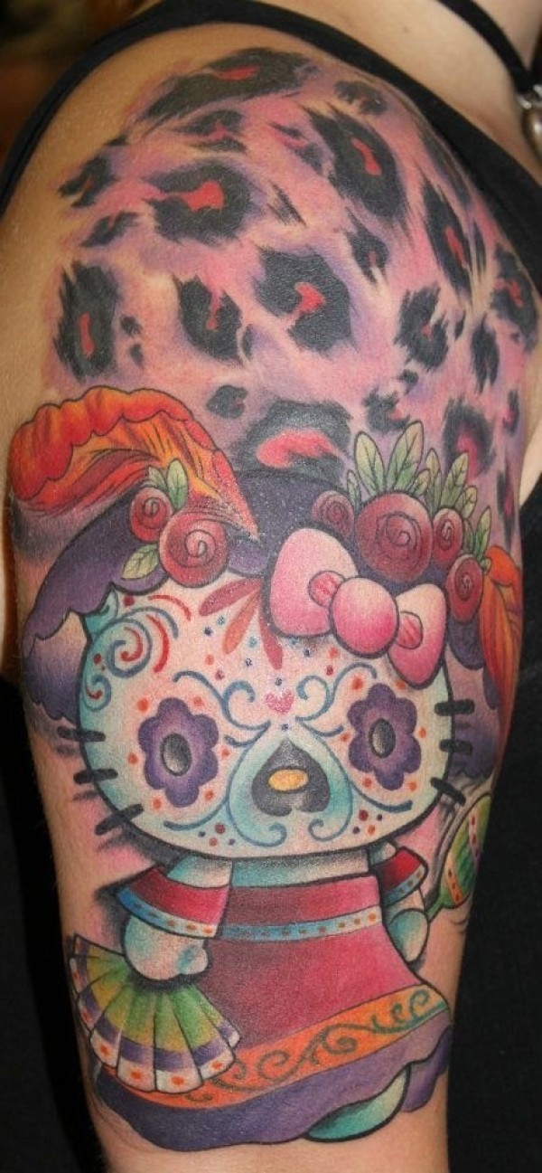 肩部彩色墨西哥传统凯蒂猫纹身图片