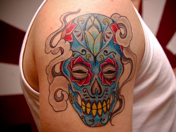 墨西哥本土五彩微笑骷髅纹身图片