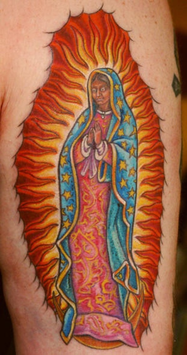 肩部彩色瓜达卢佩处女纹身图案