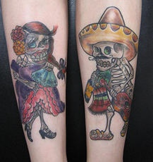 手臂彩色墨西哥夫妇糖骷髅纹身