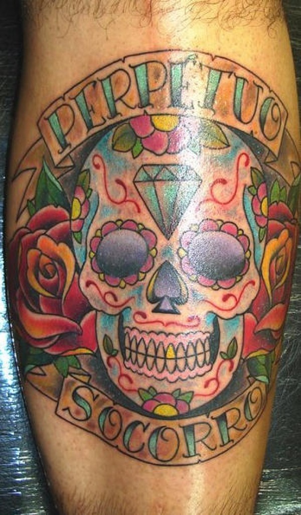 腿部彩色冰糖骷髅纹身图案