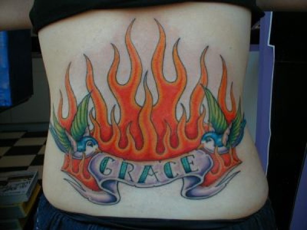 腰部彩色火焰和麻雀纹身图案