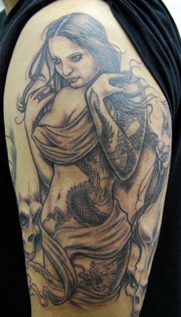 肩部黑棕色女孩赤裸纹身图案