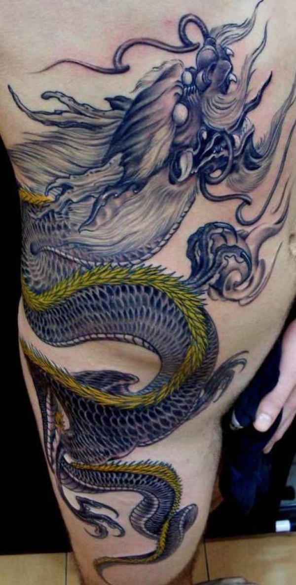男性腰侧彩色龙纹身图案