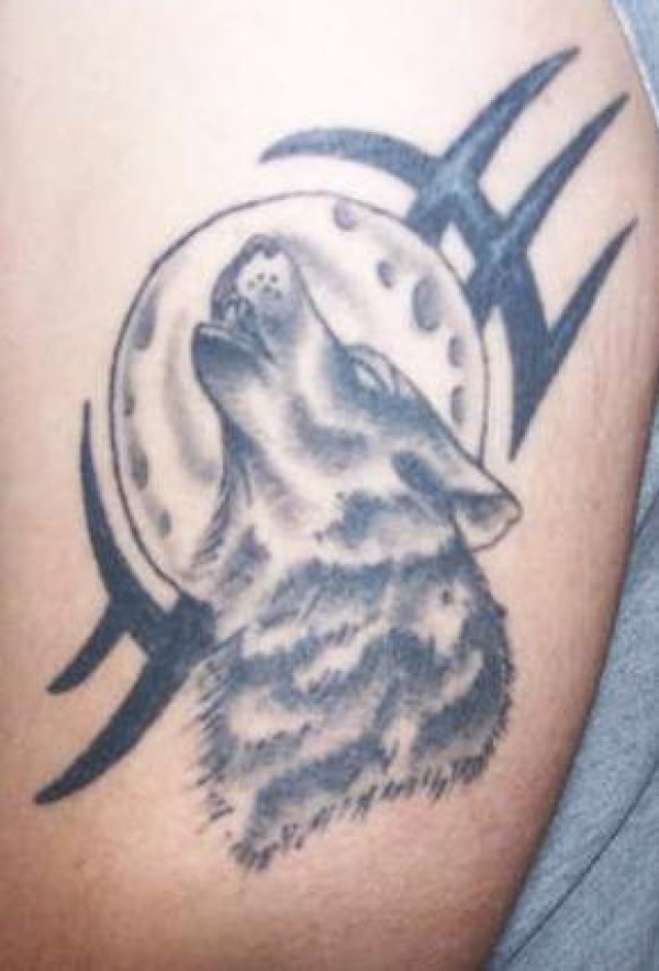 肩部黑灰Wolf tattoo狼与月亮纹身