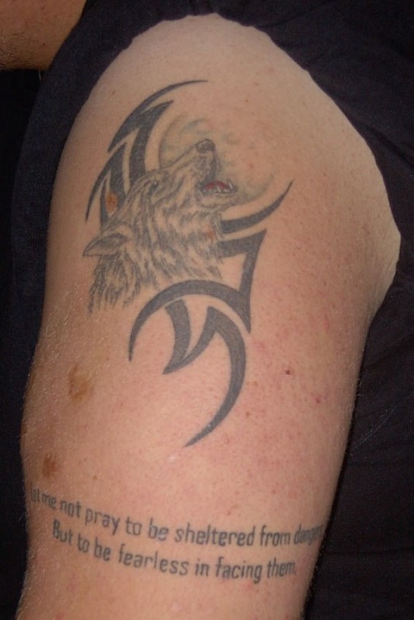 肩部黑色月亮上的狼嚎和部落纹身