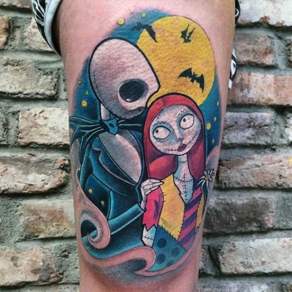 腿部漫画风格的彩色圣诞节主题纹身图案