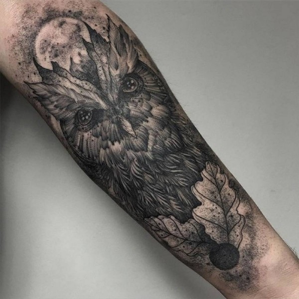 手臂黑色手绘黑猫头鹰纹身图案