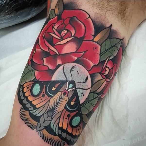 肩部彩色old school红玫瑰和蛾色纹身图案