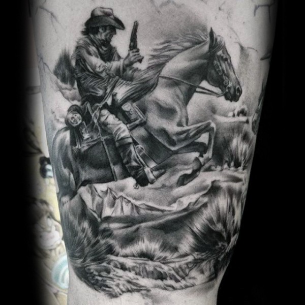 腿部黑灰老西部电影枪战纹身图案