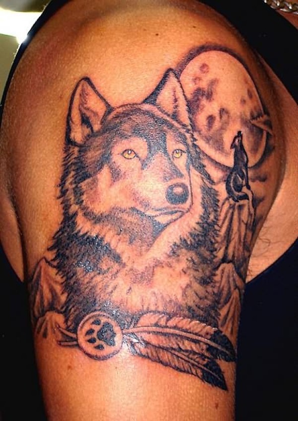 肩部棕色月亮和狼的纹身图案