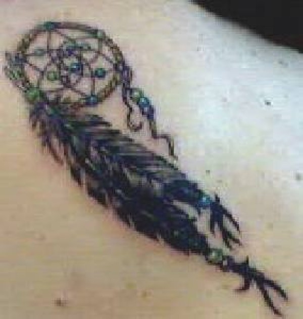肩部彩色有羽毛的捕梦器纹身