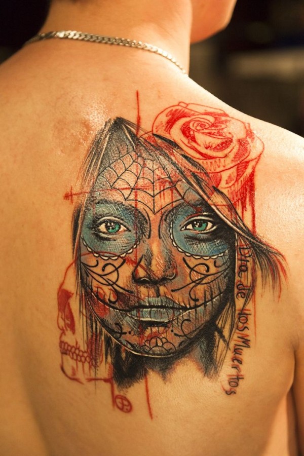 肩部彩色死亡女性纹身图案