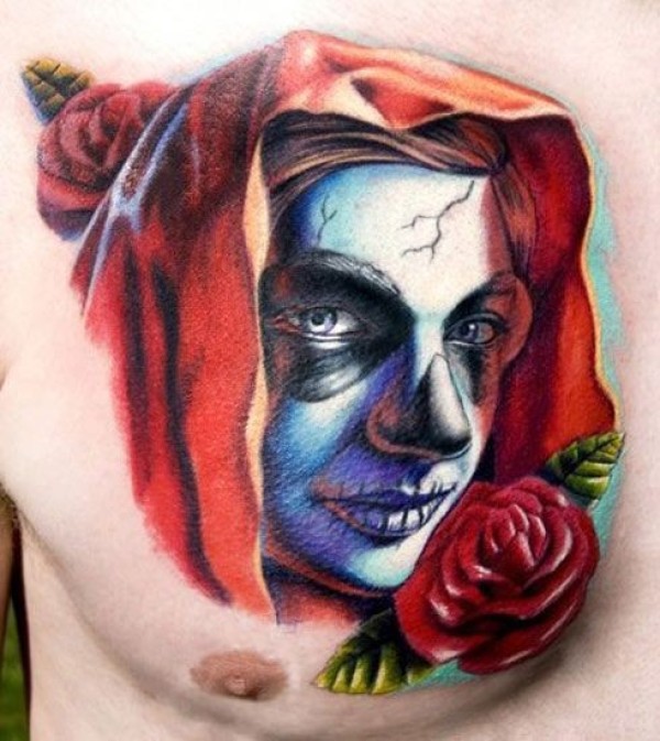 胸部彩色死圣肖像纹身图案
