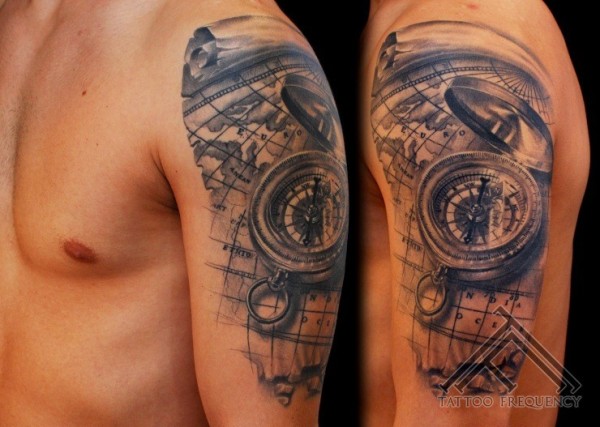 肩部黑灰航海指南针纹身图案