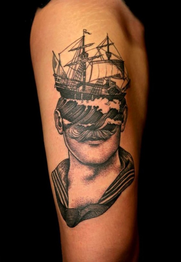 肩部黑色独特风格海上主题纹身图案