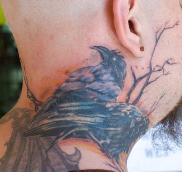 脖子逼真乌鸦在树上的纹身图案
