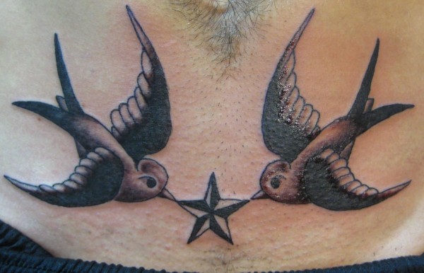 腹部黑灰两只麻雀捧星星纹身图案