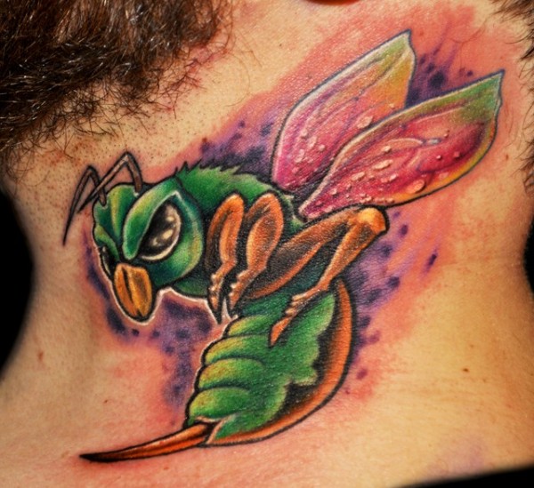 脖子彩色愤怒的蜜蜂纹身图案