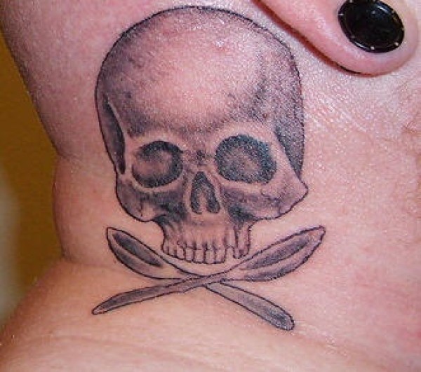 颈部灰色十字匙骷髅头纹身图片