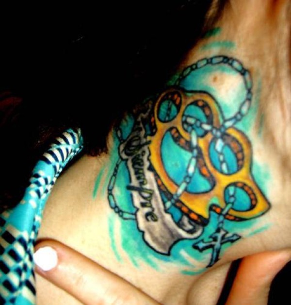 男性脖子彩色金掸子纹身图案