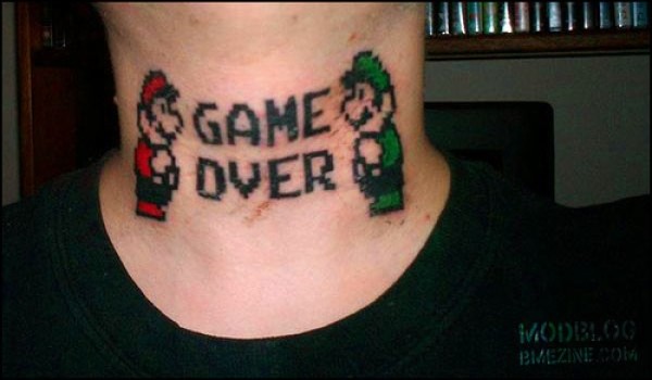 脖子上彩色马里奥纹身图案