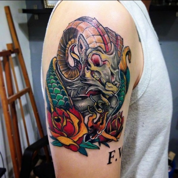 肩部彩色山羊骷髅头纹身图案