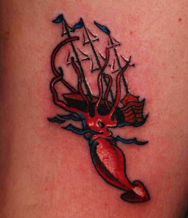 腰部彩色章鱼袭击船纹身图案