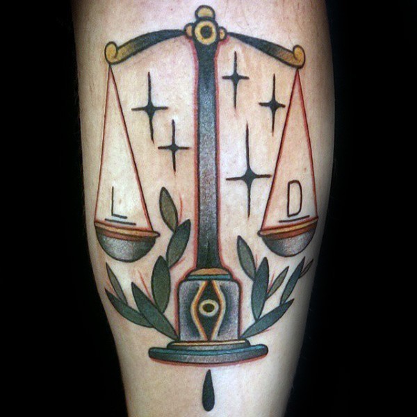 腿部彩色old school天秤座纹身图案