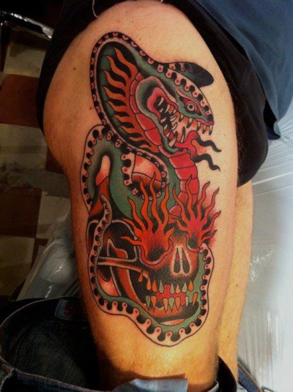 腿部彩色蛇与人类头骨纹身图案