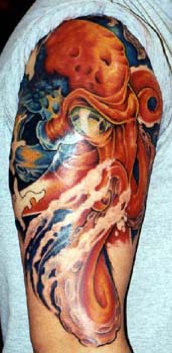 肩部彩色大洋与章鱼纹身图片