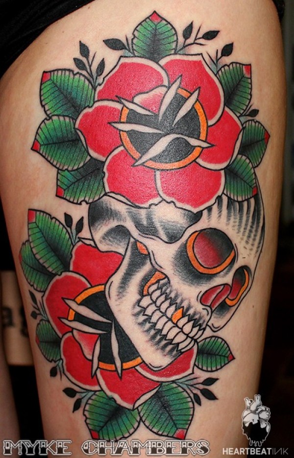 腿部彩色old school玫瑰和人类头骨纹身