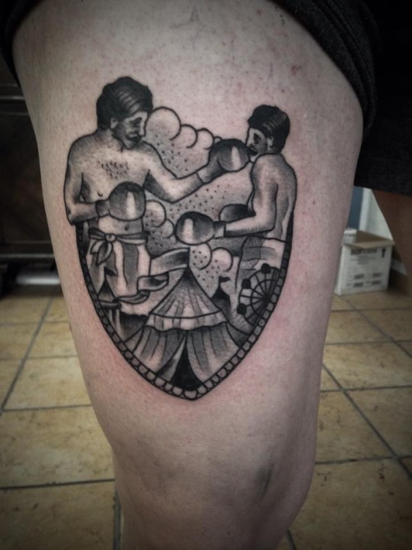 腿部黑灰马戏团拳手纹身图案