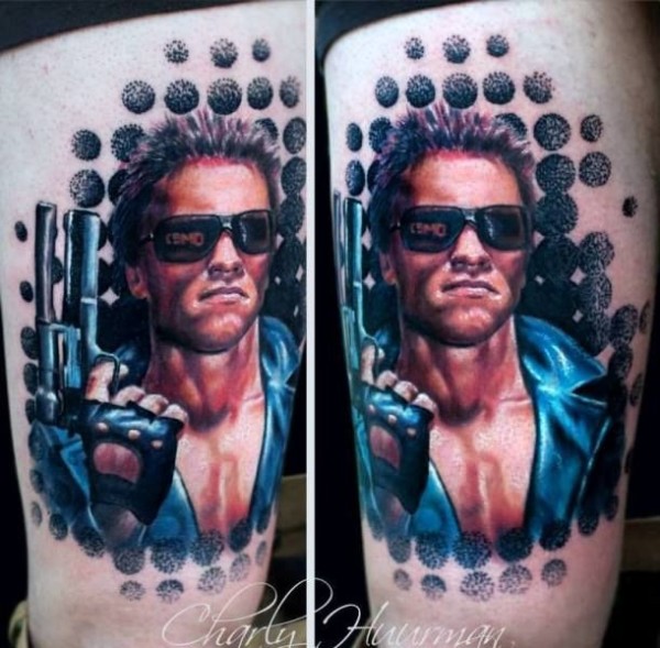 老派风格的彩色大腿终结者纹身图片