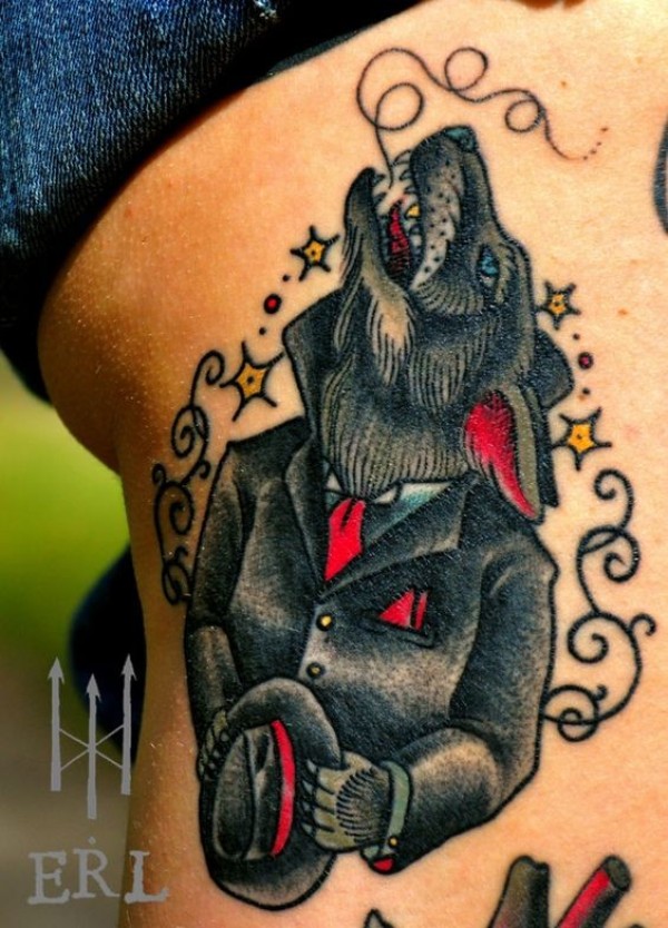 腿部old school彩色西装狼纹身图片