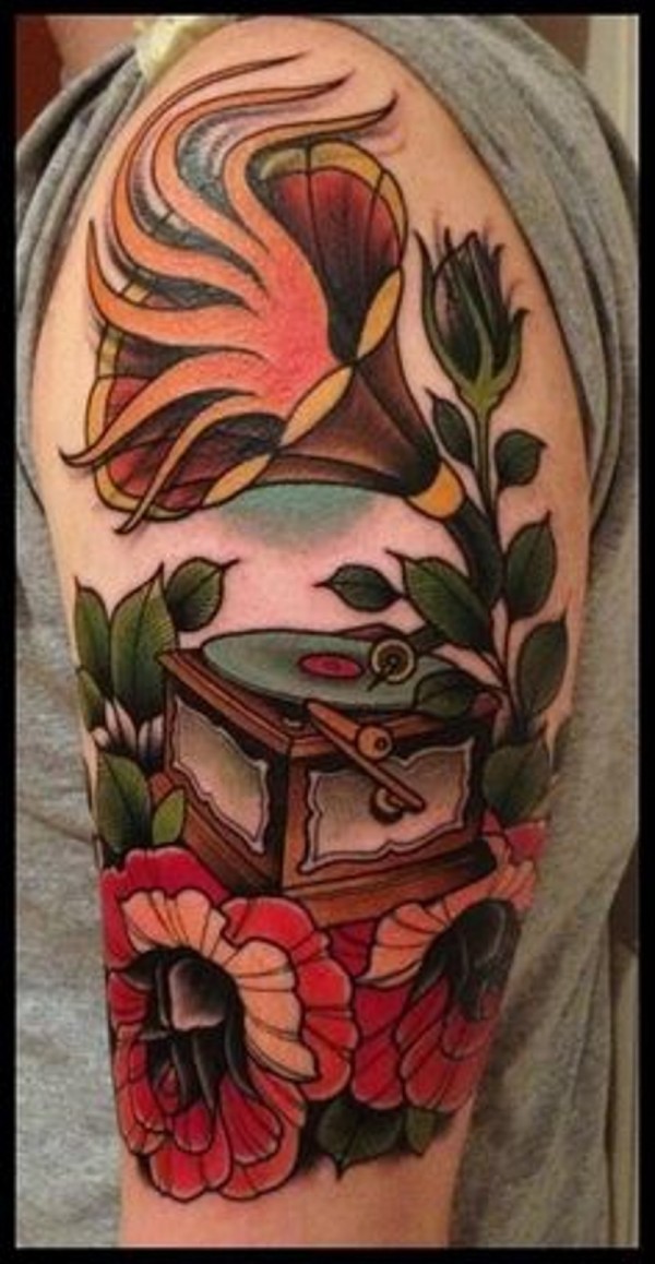 肩部彩色old school留声机纹身图案