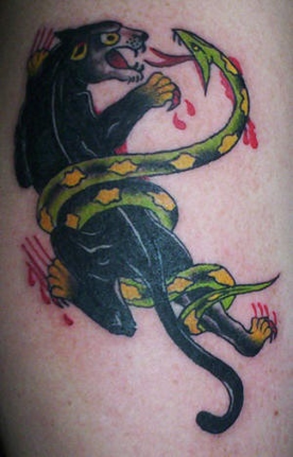 肩部彩色老豹斗蛇纹身图案