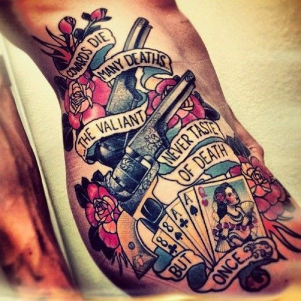 腰侧老学校风枪和扑克牌纹身图案