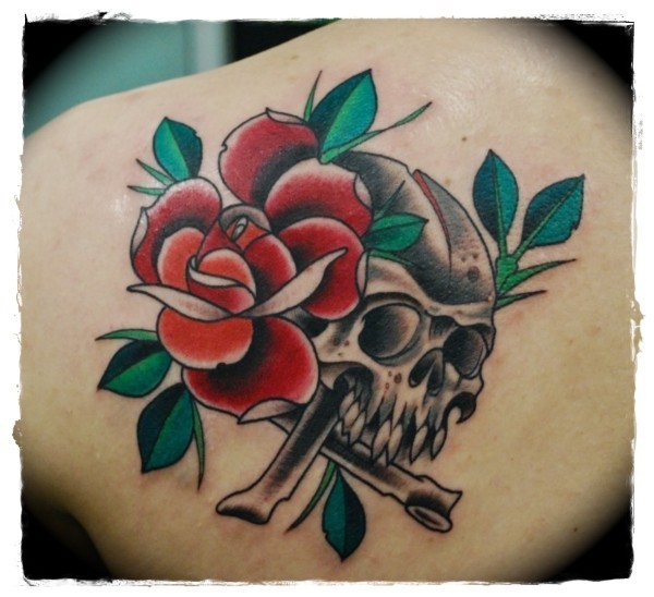 肩部彩色老派风格的红玫瑰骷髅纹身